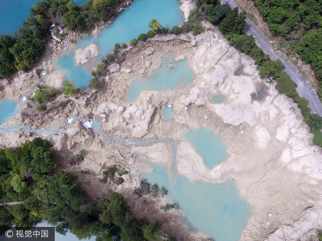 四川阿坝,航拍震后的九寨沟景区。著名景点火花海干涸见底,部分海子两岸出现塌方,水面浑浊。2017年8月8日21时19分,在四川阿坝州九寨沟县(北纬33.20度 ,东经103.82度)发生7.0级地震,震源深度20千米。
