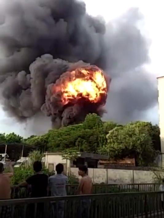 8月16日傍晚,广东东莞塘厦镇一工业区附近起火后疑发生爆炸,现场黑烟滚滚,火光冲天。警笛声中,大量市民驻足围观拍照。截至晚7时,当地消防等多个部门已赶赴现场处置。来源:新京报