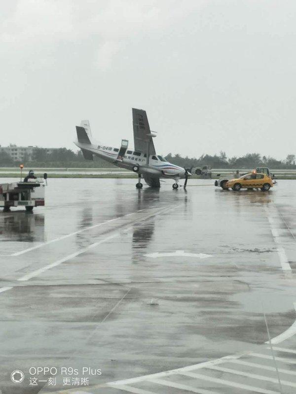 天鸽已来到香港天文台正南不到100公里,正在高速西偏北行,即将在中午前后在珠海机场附近登陆。天鸽的眼壁仍然在爆发对流,台风眼迅速清空,已有超强台风特征,它将成为1964年台风露比以来对港、珠、澳影响最大的台风。图为在台风中受损的飞机。