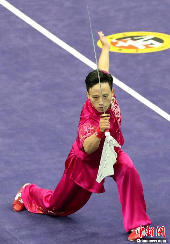 8月28日,天津全运会武术套路比赛在天津理工大学体育馆举行,山东选手孙培原获得男子长拳、刀术、棍术全能冠军。图为孙培原在刀术比赛中。 中新社记者 张宇 摄