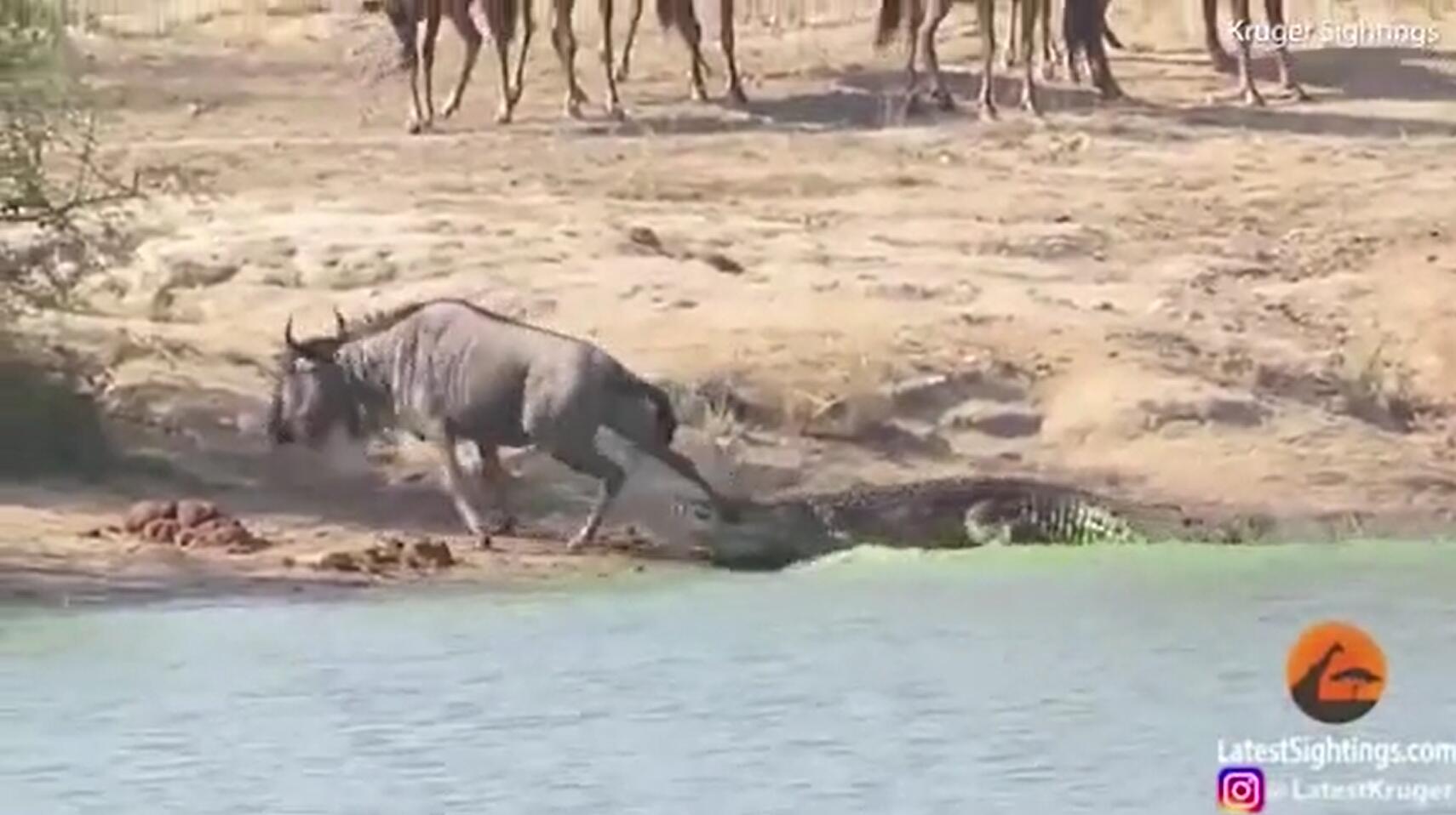 牛羚被鳄鱼拖水里险丧命 被河马救了