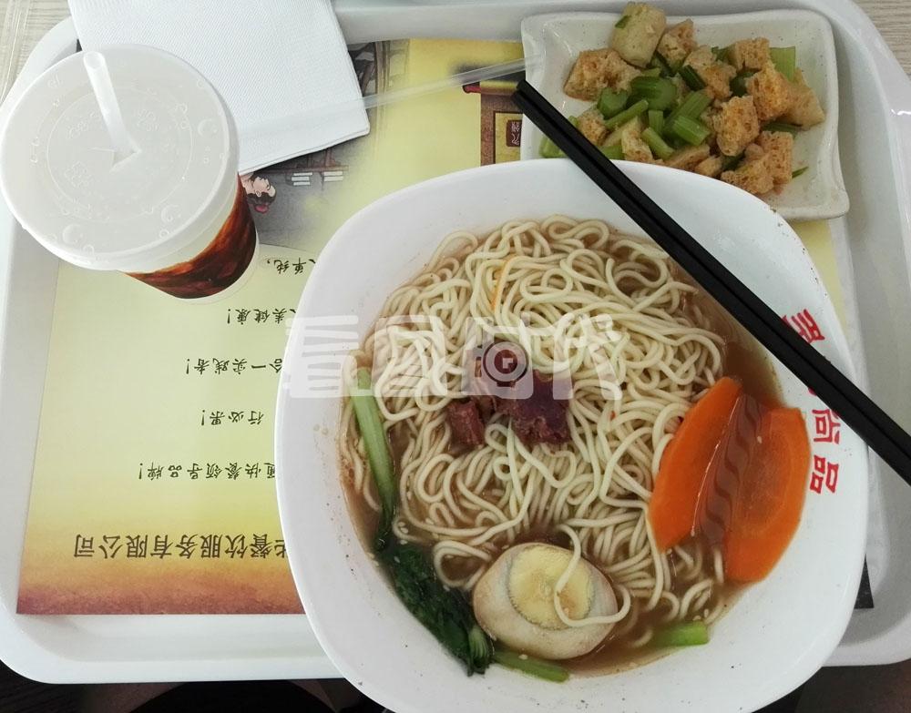 因为赶火车,没有顾得上吃中午饭,只好在高铁站里吃“高价饭”了。要了一份牛肉面套餐——一碗牛肉面,巴掌大的小盘凉菜,一小杯饮料,您猜一共多少钱?