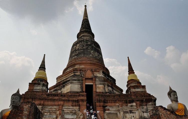 泰国大城府的胜利大佛塔寺(哇艾猜蒙坤寺)建于13世纪,为一敕封佛寺,为大城王朝创始者羽通王时代修建。整座寺庙建筑宏伟精致,是大城府现存最古老的建筑,寺内现以卧佛和宝塔著称,塔的周围排列有数十座坐佛雕像。寺内有一大佛塔,登上佛塔可遥望四周美景,另有一尊白色29米长的巨型卧佛像,是佛寺的两大看点。