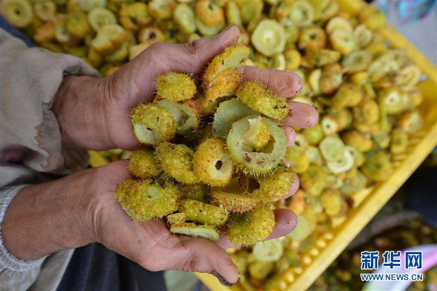 9月4日,贵州省龙里县茶香村的农户展示切成片的新鲜刺梨。 连日来,贵州省黔南布依族苗族自治州龙里县的刺梨果进入丰收季,农户抢抓晴好天气采摘刺梨鲜果供应加工企业和种植大户。从2000年起,该县以退耕还林项目实施为契机鼓励全县人民种植刺梨树。如今,刺梨种植面积达21万亩,挂果9.1万亩,年产鲜果可达4.6万吨。同时通过引进8家刺梨精深加工企业,加大刺梨浓缩汁、刺梨饮料、刺梨果脯等系列产品的研发力度,2016年产值达3.75亿元。刺梨产业已经成为当地农民增收致富的绿色支柱产业。新华社发(潘希来 摄)