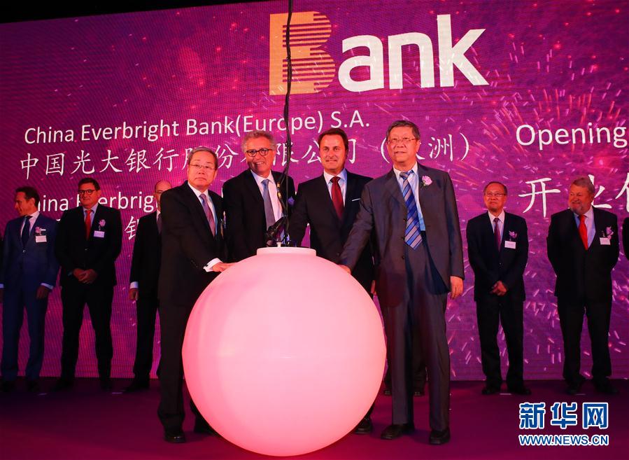 9月8日,在卢森堡首都卢森堡,光大银行董事长唐双宁(前右一)、卢森堡首相贝泰尔(前右二)和中国驻卢森堡大使黄长庆(前左一)出席中国光大银行股份有限公司(欧洲)(简称“光银欧洲”)、光大银行卢森堡分行开业揭牌仪式。中国光大银行股份有限公司(欧洲)(简称“光银欧洲”)、光大银行卢森堡分行8日在此间举办开业揭牌仪式,以及“‘一带一路’倡议与中国企业投资欧洲论坛”。新华社记者龚兵摄