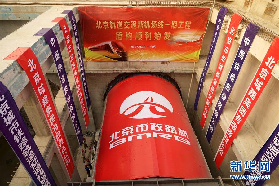 这是9月15日在北京大兴区黄村镇拍摄的新机场中段盾构施工现场。 9月15日,位于北京大兴区黄村镇的新机场中段盾构施工现场,直径8.8米的大盾构正式下井首发,标志着新机场轨道线开始盾构施工。新机场轨道线工程全长41.36千米,包括盾构段、高架段和新机场北航站楼站、磁各庄站、草桥站三座车站,其中工程盾构段长约16.15千米。新华社发
