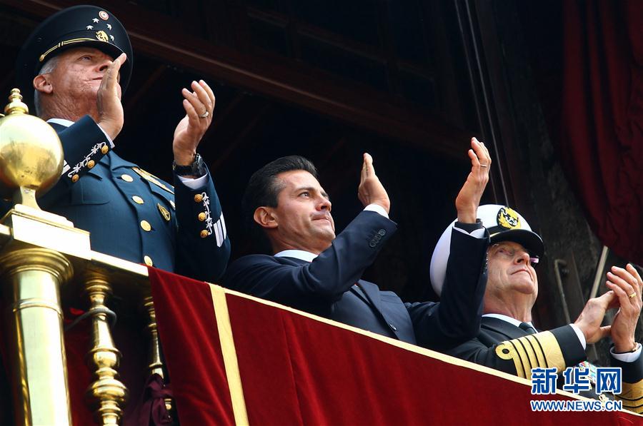 9月16日,墨西哥总统培尼亚(中)出席在首都墨西哥城举行的独立日阅兵活动。当日,墨西哥举行庆祝独立207周年阅兵活动。每年9月16日是墨西哥独立日。 新华社发