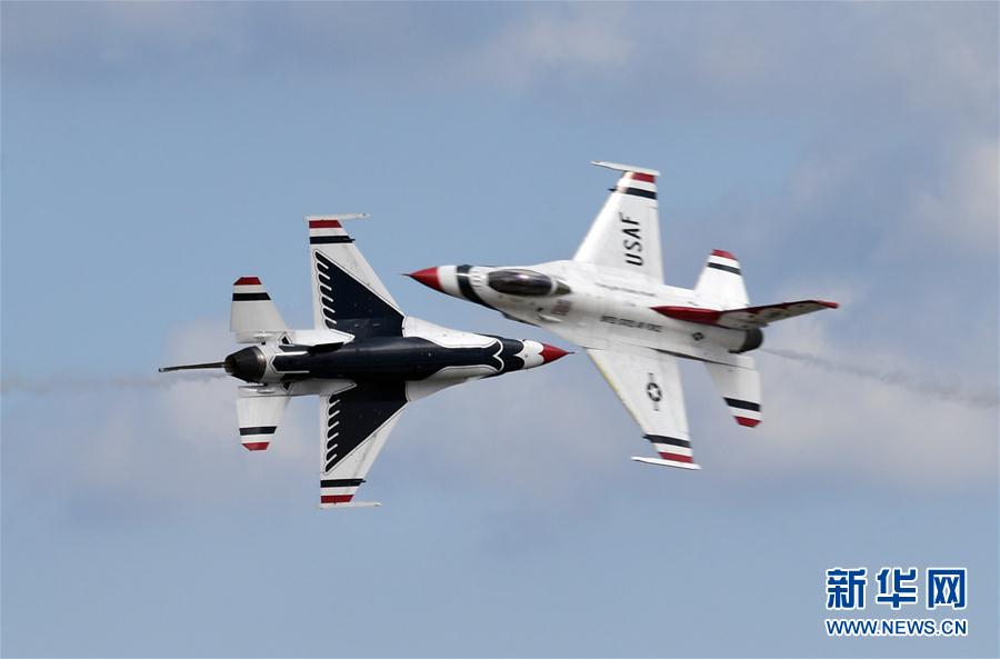 9月16日,在美国首都华盛顿附近的安德鲁斯空军基地,美国空军“雷鸟”飞行表演队进行特技飞行表演。 为纪念美国空军建军70周年,安德鲁斯空军基地16日举行大型飞行表演。 新华社记者殷博古摄