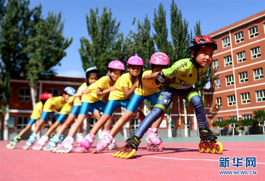 9月16日,在张家口市回民小学,轮滑社团的成员在进行轮滑训练。 近年来,河北省张家口市回民小学聘请专业老师和教练,在校园内举办轮滑、书法、绘画等特色校园社团活动,丰富孩子们的生活。 新华社记者 王晓摄