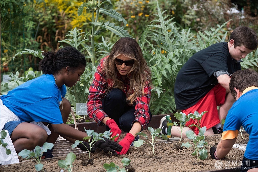 当地时间2017年9月22日,美国华盛顿,美国“第一夫人”梅拉尼娅现身白宫菜园,与学生一起收种蔬菜。图:视觉中国