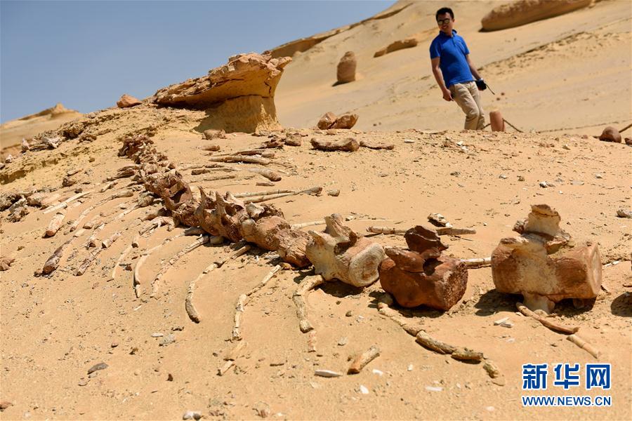 9月27日,在埃及法尤姆省的“鲸鱼谷”,游客参观古鲸类化石。“鲸鱼谷”位于埃及南部法尤姆省的沙漠深处。这里4000万年前是一片汪洋,如今被建成博物馆,展有许多古鲸类化石。摄影:赵丁喆