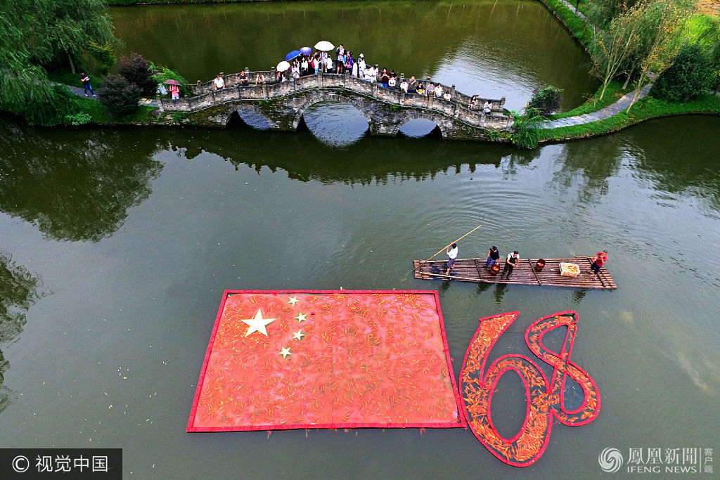 2017年9月28日,江西省婺源县紫阳镇瑶湾村农民用6800尾荷包红鲤鱼,拼成了长15米、宽6.8米的巨大国旗,向中华人民共和国成立68周年而献礼。图:视觉中国