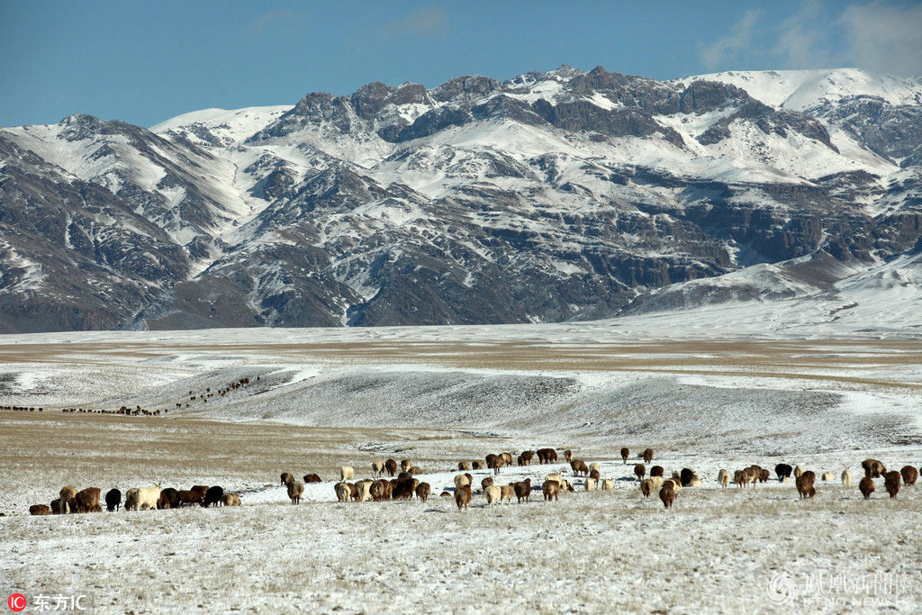 2017年10月1日,受寒潮天气入侵影响,新疆哈密市巴里坤草原迎来秋后的第一场降雪。图:东方IC 晓薇/摄