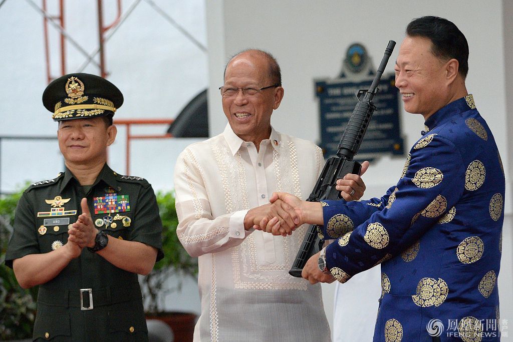 10月5日,菲律宾国防部和武装部队,在马尼拉接收了由中国援助的一批武器装备,这是中国今年第二次向菲方提供用以打击恐怖主义的武器。菲国防部长洛伦扎纳和武装部队总参谋长阿诺当天在菲武装部队总部从中国驻菲大使赵鉴华手中接收了中国援助的步枪、子弹和瞄准镜等武器装备。视觉中国/供图