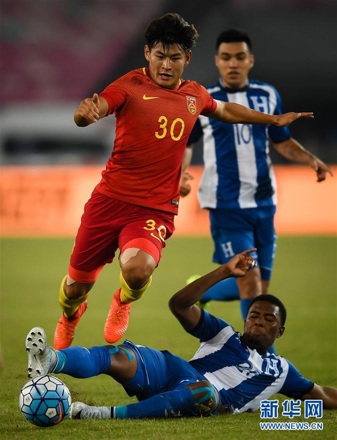 10月7日,中国队球员魏敬宗(左上)在比赛中进攻。当日,在江苏省江阴市举行的2017年中国足协中国之队国际足球赛中,中国U22国家男子足球队以2比2战平洪都拉斯U22国家男子足球队。新华社记者 李响 摄 新华社南京10月7日电(记者王恒志)凭借上下半场各一粒点球,中国U22男足国家队7日在江苏江阴2:2战平洪都拉斯U22男足,韦世豪和张玉宁分别命中点球。 本场比赛国家队主帅里皮和江苏苏宁队主帅卡佩罗均到场观战,开场后两队互有攻守,34分钟洪都拉斯队凭借弗洛雷斯禁区外一脚世界波打破场上僵局。5分钟后中国队门将和后卫出现失误,弗洛雷斯抓住机会再下一城,客队2:0取得领先。上半场伤停补时阶段,李帅突入对方禁区被放倒,主教练判罚点球,韦世豪一蹴而就,上半场U22国足1:2落后。 易边再战,双方再度陷入僵持阶段,81分钟巴顿杀入对方禁区被放倒,中国队再度获得点球,张玉宁为中国队扳平了比分。最终这场比赛以2:2告终。 U22国足明年将参加U23亚洲杯,此番里皮亲自来到江阴指导观战,显示出里皮对年轻球员培养的重视,他也对队员们表示如果表现好就有机会进国家队,或许不久后的国家队里会出现多位U22球员的身影。