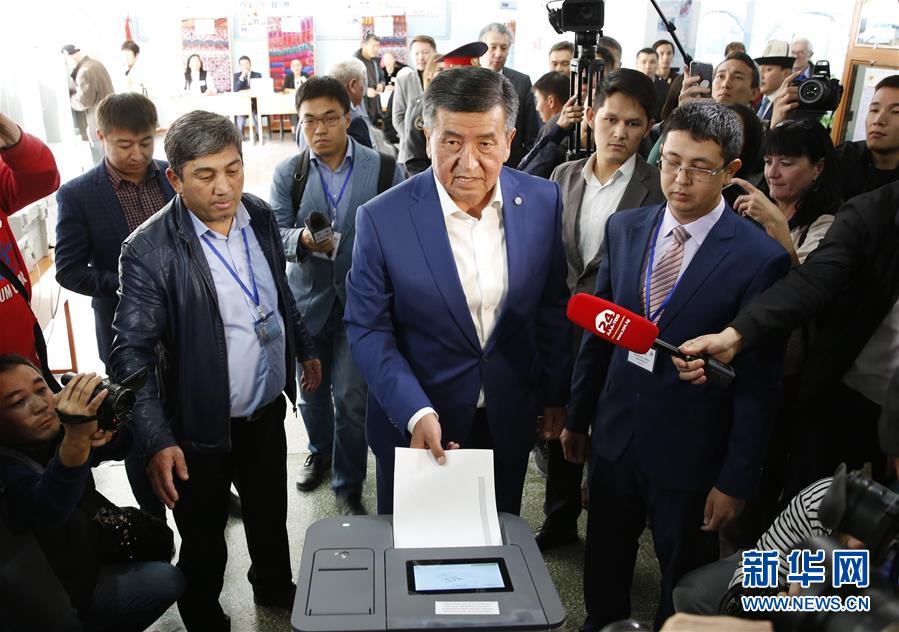 10月15日,在吉尔吉斯斯坦比什凯克,社会民主党候选人、前总理索隆拜·热恩别科夫(中)在一处投票站投票。 吉尔吉斯斯坦中央选举委员会15日晚公布的初步计票结果显示,现任总统阿坦巴耶夫所在的社会民主党候选人、前总理索隆拜·热恩别科夫获得54.77%的选票,在当天举行的总统选举中获胜。 新华社发(罗曼 摄)