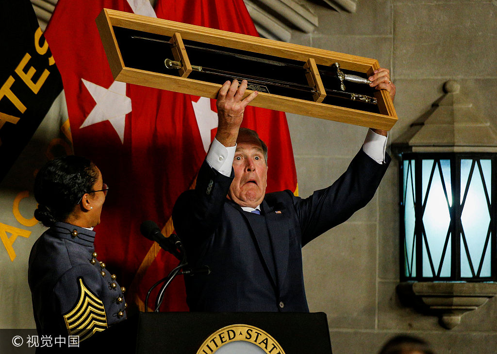 当地时间2017年10月19日,美国纽约,美国前总统小布什在西点军校被授予塞万努斯·塞耶尔奖。供图:BRENDAN MCDERMID/视觉中国