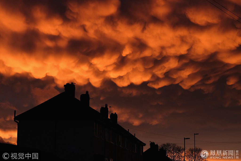 当地时间2017年10月28日,英国英格兰,日落时分天空中的乳状云。“乳房云”是在积雨云下方形成的乳状型积云,是当下降气流里头温度较冷的空气与上升气流中温度较暖的空气相遇,而形成如同一个个袋子形状的云朵。