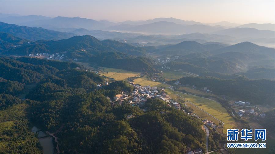 福建省上杭县中都镇军联村周边稻浪滚滚(10月27日摄)。 新华社记者 宋为伟 摄 10月28日,邓红梅(前)将一些遗撒的晚稻扔进收割机的铲斗中。 新华社记者 宋为伟 摄 10月28日,在收工后,邓红梅为李兵拍打衣服上的尘土。 新华社记者 宋为伟 摄