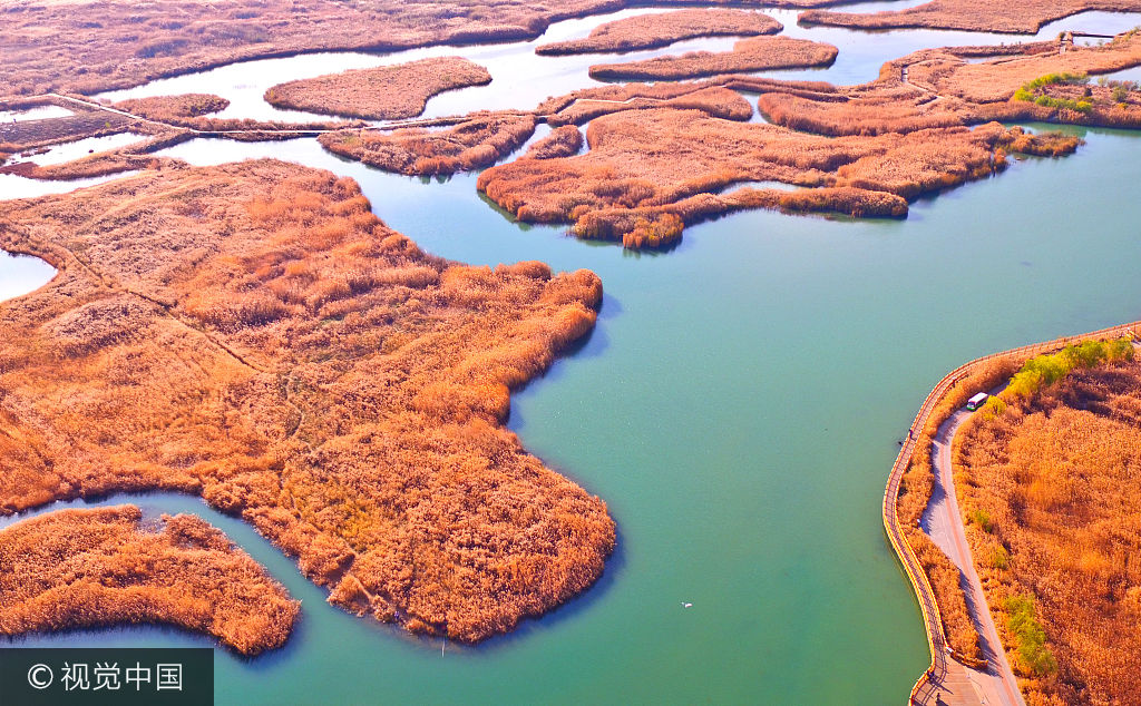 2017年10月30日,从空中拍摄的甘肃张掖国家湿地公园一角。深秋张掖国家湿地公园内的树木、芦苇、蒲草等植物在冷空气的侵袭下变成了金黄色,犹如“满地尽带黄金甲”,吸引了陕西、新疆、青海、江苏等省市的众多游客慕名前来参观游览。来源:王将/视觉中国