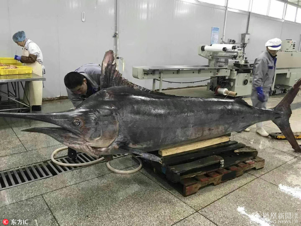 2017年11月3日,吉林长春硅谷大街附近,某鲜生海鲜餐厅门口,一条千斤左右的剑鱼被现场分解出售。很多过往市民纷纷围观,有市民只买了一小块就花了1000元。