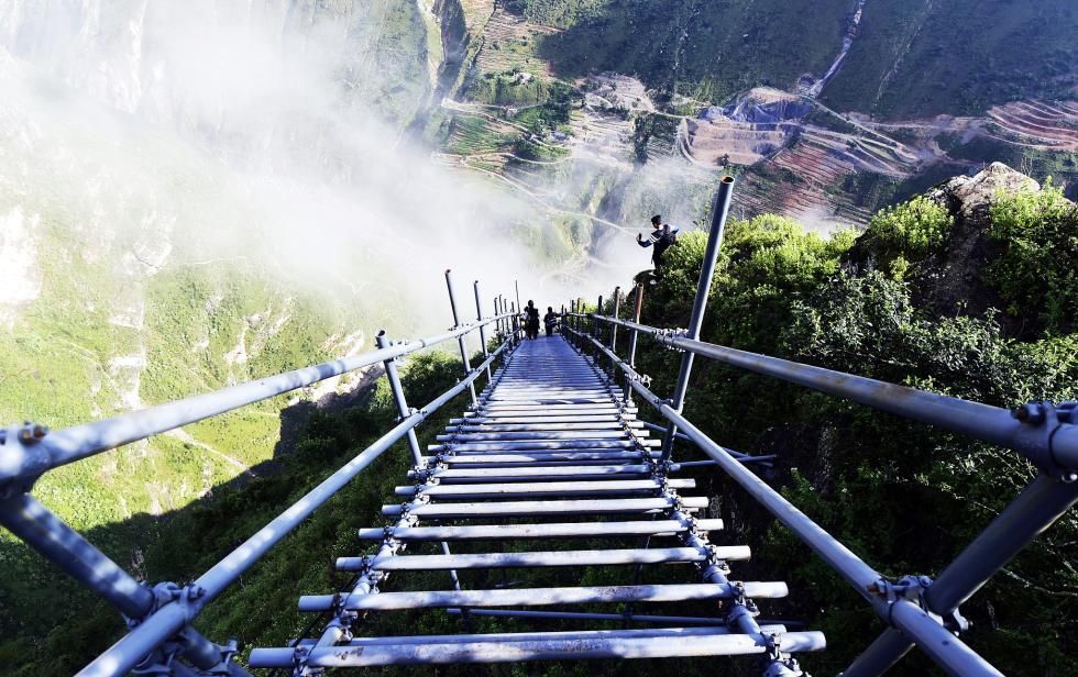 投入资金150多万元,经过3个多月的施工,将原来的藤梯换成钢梯。在修建钢梯时,村民出工出力,将40多吨、约1500根钢管一根根背上山,组成了21处、767级牢固的台阶。