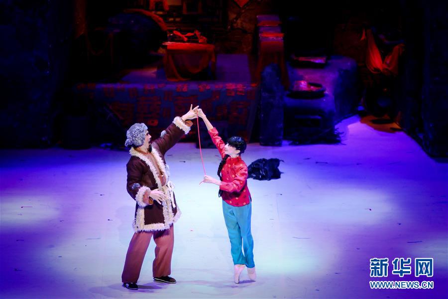 11月9日,在日本东京,松山芭蕾舞团团长、第二代白毛女扮演者——69岁的森下洋子(右)在芭蕾舞剧《白毛女》中饰演喜儿。日本松山芭蕾舞团9日晚在东京演出该团代表剧目《白毛女》。 新华社记者 马曹冉 摄