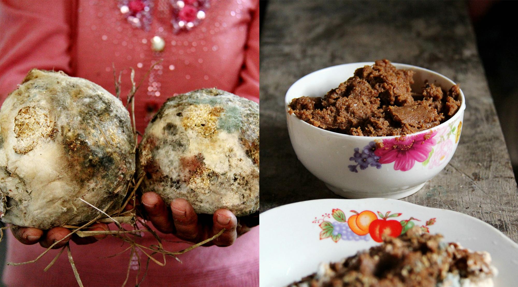在东北地区,很多东北人的饮食一辈子都离不开大酱。他们说:“不吃东北大酱干活都没劲”。辽东地区加工东北大酱有一千多年的历史,满族祖先靺鞨人制作大酱史书上有着详实的文字记载。然而这个在东北饮食文化中避不开的大酱,制作周期很长,最少4个月,多则1年。而辽宁丹东地区,发酵一个月的酱引子都发霉长毛了,却能做出让人垂涎欲滴的东北大酱,不由让人赞叹中华传统美食的神奇。