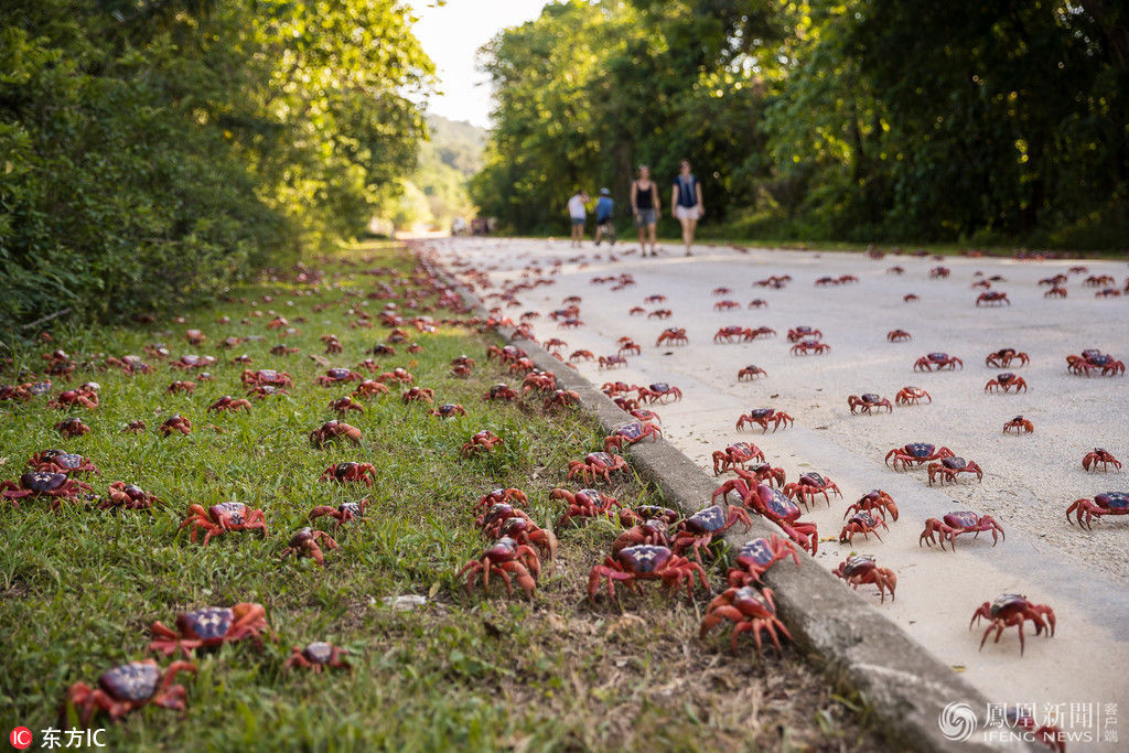 2017年11月15日报道,澳大利亚圣诞岛迎来了一年一度的螃蟹大迁徙,数百万只红蟹一齐出动,奔赴大海产卵繁衍后代。为保证它们的顺利迁徙,圣诞岛当局还封锁道路,为它们开路护驾。