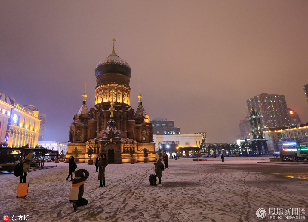 2017年11月10日,黑龙江省哈尔滨市,风雪中的地标建筑,索菲亚教堂。来源:东方IC/n
