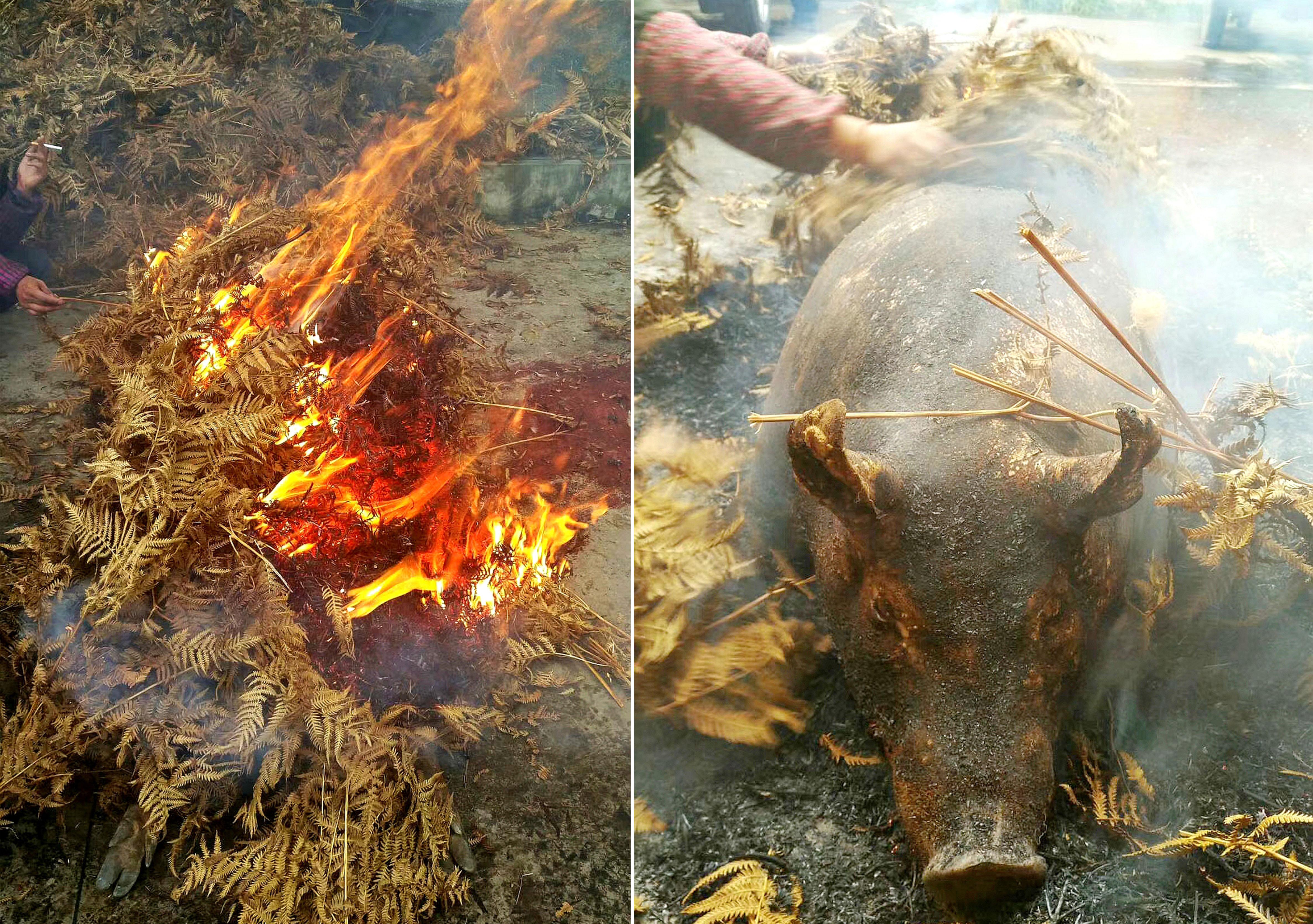 11月20日,四川省凉山彝族自治洲布拖县当地一村民用手机拍摄了一组大凉山彝族年杀猪的照片分享到朋友圈,用蕨叶火烧猪毛的奇特场面引发众多网友围观。当地过彝族年的这三天,彝语称第一天为“库施”、第二天为“多博”、第三天为“博基”。第一天清晨,太阳还未从地平线升起,主人就在家门口挖灶烧水,等待杀年猪。用蕨叶烧猪毛是彝族人的传统,这样处理的猪肉,比开水烫的要好吃得多。