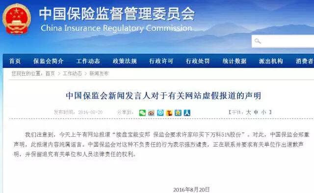不过,这一报道迫使保监会迅速出面辟谣。保监会在官方网站发表声明表示,上述“报道内容纯属谣言,中国保监会对这种不负责任的行为表示强烈谴责,正在联系并要求有关单位作出道歉声明,并保留追究有关单位和人员法律责任的权利。”
