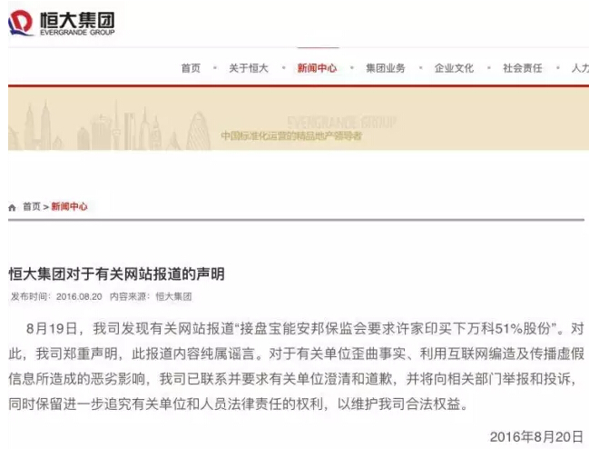 8月19日,我司发现有关网站报道“接盘宝能安邦保监会要求许家印买下万科51%股份”。对此,我司郑重声明,此报道内容纯属谣言。对于有关单位歪曲事实、利用互联网编造及传播虚假信息所造成的恶劣影响,我司已联系并要求有关单位澄清和道歉,并将向相关部门举报和投诉,同时保留进一步追究有关单位和人员法律责任的权利,以维护我司合法权益。