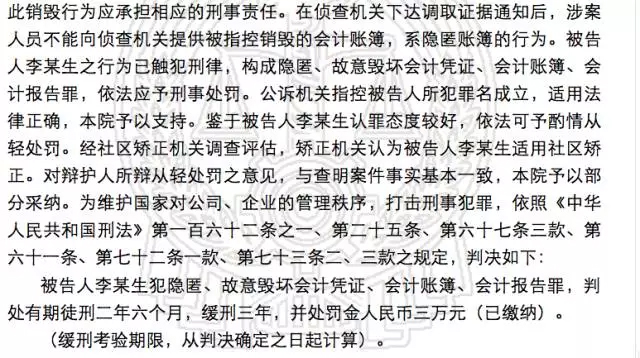 2016年9月8日,平遥法院认定,李清生犯隐匿、故意毁坏会计凭证、会计账簿、会计报告罪,判处有期徒刑两年六个月,缓刑三年,并处罚金三万元。