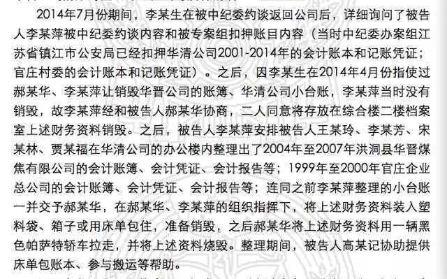 法院审理阐明,2014年7月初,李清生在被中纪委约谈返回公司后,详细询问了李某萍被中纪委约谈内容和被中纪委扣押账目内容,并安排李某萍整理并销毁剩余的财务资料。