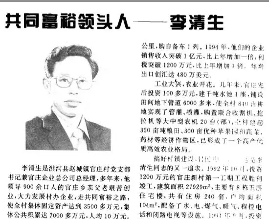 报道描述称,李清生和其他村干部一道逐户上门,将“借鸡生蛋”的主张细说给村民,并赢得广泛认同。随后,李清生骑着摩托车跑临汾,走洪洞,奔走太原等地,建起了全省第一座村办洗煤厂,“当年实现产值207万元,全村人均收入一下猛增至1025元,三年后高达4000元,率先实现了共同富裕。”