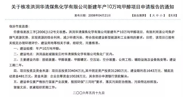 山西省发改委网站显示,2008年4月,山西省发改委核准了华清煤焦“新建年产10万吨项目”。该项目年产周期2年,项目总投资3.34亿元,建设地点在官庄村华清煤焦焦化厂区内。该公告的落款时间是2006年5月19日。