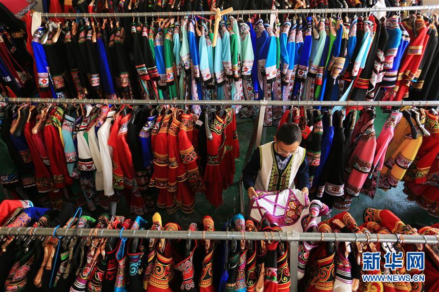 5月17日,苏涛查看制作好的民族服饰。彝族人苏涛是贵州省威宁彝族回族苗族自治县经济开发区小微企业创业园的一名创业者。新华社发(王纯亮 摄)