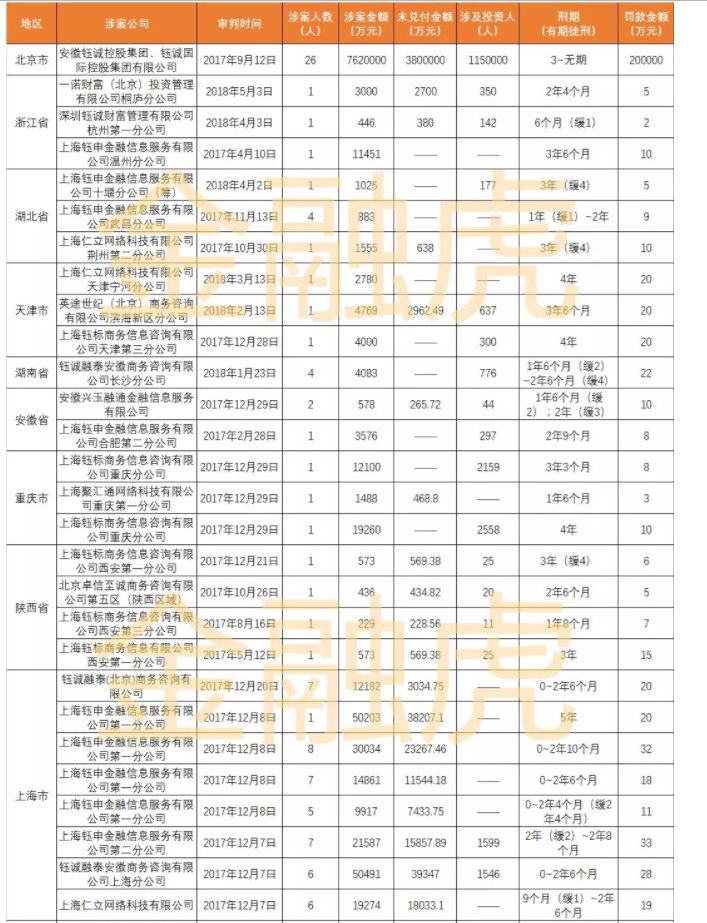 据金融虎不完全统计,目前已有北京、上海、天津、重庆、浙江、湖北、湖南、安徽、陕西、江西、广东、吉林、辽宁等13个省市对38起诉讼案相继做出宣判。其中,上海市有8起诉讼案宣判,是宣判数量最多的地区。8起案件中,涉案人员最高被判刑5年,并处罚金20万元。