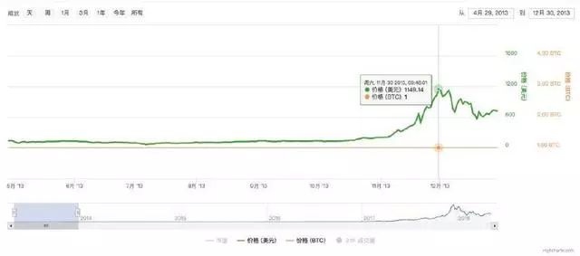 塞浦路斯发生债务危机,人人自危,比特币受到了欧洲避险资金青睐,短短几天从 30 多美元飙涨到 265 美元。随后一周,市场趋于理性,比特币又暴跌至 68 美元。2013 年 12 月比特币价格达到了 1147 美元 Coindesk 数据 的高位,这也是比特币价格第一次超过国际金价。