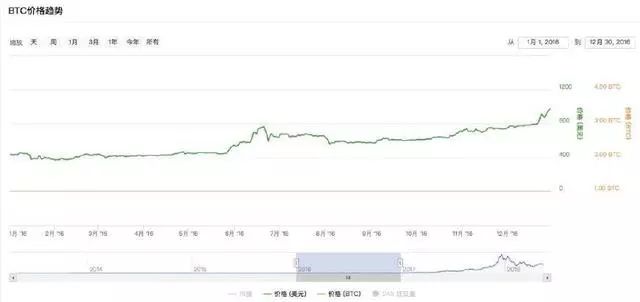 比特币市场迎来巨大变化,内部变化是年产量开始收缩,外部变化是受英国脱欧、美国大选、亚洲投资者激增等事件影响,价格持续上涨,截止2016年12月突破 1000 美元。一度创造了 160% 的惊人涨幅。