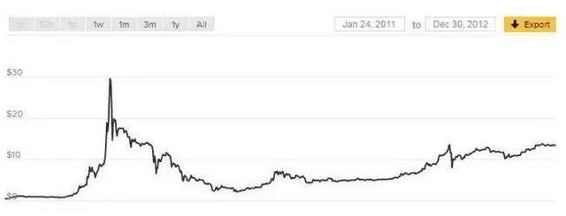比特币迎来了成长过程中的第一次泡沫,价格达到 30 美元。之后一周之内,Mt. Gox 黑客事件发生,比特币价格急剧回落,暴跌至 10 美元。腰斩后,是一条漫长的下滑之路……