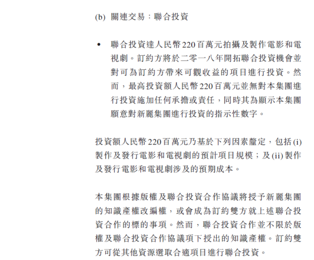 公告显示,阅文集团和新丽传媒将联合投资达人民币2.2亿元拍摄及制作电影和电视剧。订约方将于2018年开拓联合投资机会并对具有可观收益的项目进行投资。然而,最高投资额人民币2.2亿元并无对阅文集团进行投资施加任何承担或责任,同时其为显示阅文集团愿意对新丽集团进行投资的指示性数字。