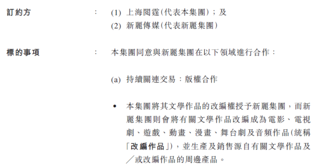 阅文集团表示,透过订立版权及联合投资合作协议,该集团所提供的文学作品可透过新丽集团将有关文学作品改编成电影、电视剧、游戏等更加丰富的形式而获得广泛发行,从而提高集团文学内容的知名度,充分发挥集团知识产权的盈利潜力。