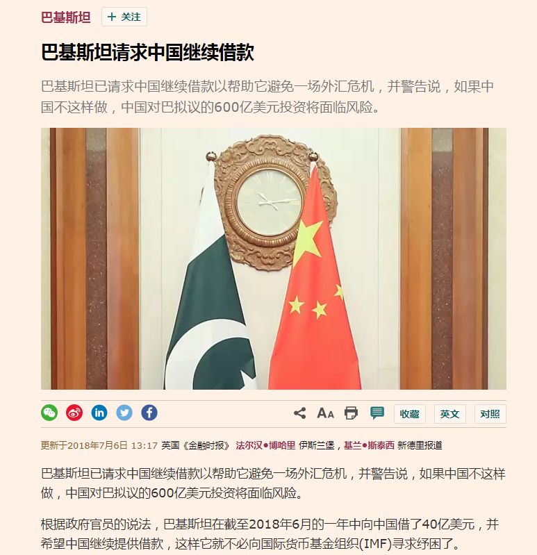 也是在昨日,英国《金融时报》曝光一条消息:巴基斯坦请求中国继续借款来帮助它避免一场外汇危机。如果中国不借,巴就要向IMF求助,那“中巴经济走廊”的一些细节就要暴露,中国600亿美元的投资将面临风险。