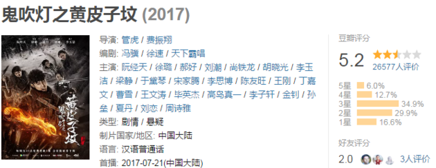 例如同样在腾讯视频播出,2016年上映的由孔笙指导的《鬼吹灯之精绝古城》达到了47.9亿次的累计播放量,豆瓣评分达到8.0分,但一年之后上映,由陆川导演的《鬼吹灯之黄皮子坟》的累计播放量仅28.5亿次,豆瓣评分为未及格,为5.2分。