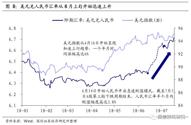 这个阶段中A股受到了多重利空打击,首先是信用风险全面爆发,这期间AA级产业债信用利差大幅飙升78BP,社融余额同比增速继续下降,特别是5月21日东方园林的发债事件直接刺激了市场情绪,从股价走势看,5月21日俨然已经成为了一个阶段性顶点。其次是在反复拉锯之后,美国正式宣布对中国加征关税,贸易战全面升级。同时由于美元指数的大幅回升,使得人民币汇率在6月下半年出现了急贬,加大了股市的下行压力。而在股市不断下挫的过程中,上市公司股权质押爆仓的风险又进一步加剧了市场的避险情绪。在多重利空下,上证综指在这个阶段连续跌破3200、3000、2800、2700的整数关口。