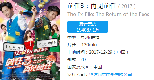 《前任3:再见前任》去年年底上映,在一度排片低迷的情况下,靠着观众的好口碑成功逆袭,不仅击败《妖铃铃》《解忧杂货店》等对手,成为今年开年的一匹票房黑马,并且引爆话题效应,最终收获19.4亿元超高票房。