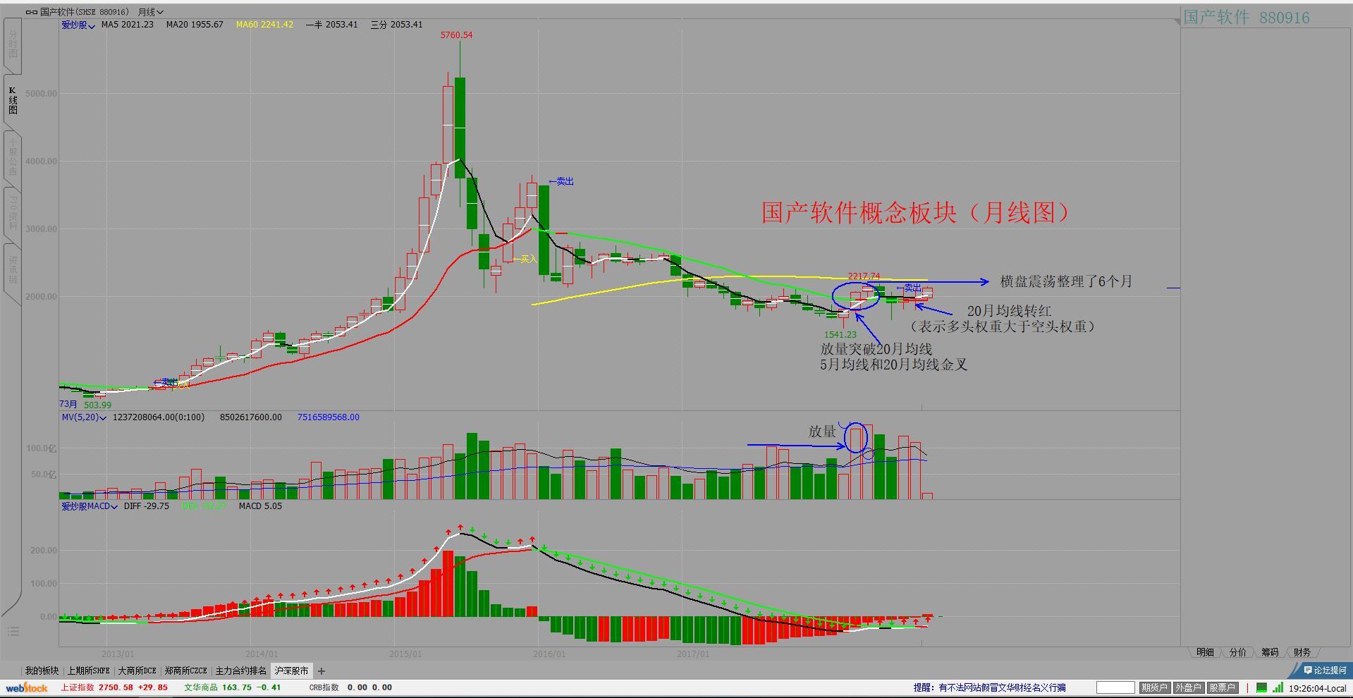国产软件概念板块(月线图)走势强于大盘1:3月份放量突破20月均线,5月均线和20月均线金叉。2:横盘震荡整理了6个月。3:20月均线转红(表示多头权重大于空头权重)行业板块中(石油,化纤)