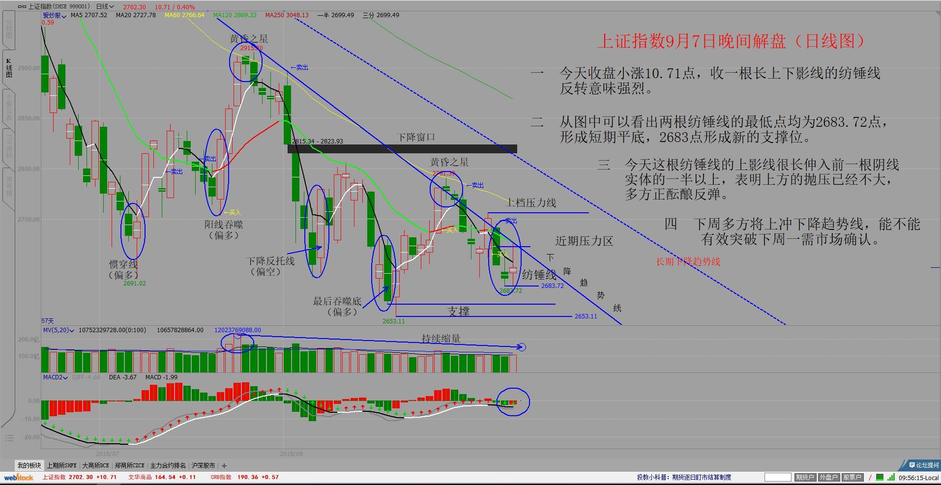 上证指数9月7日晚间解盘(日线图)一:今天收盘小涨10.71点,收一根长上下影线的纺锤线反转意味强烈。二:从图中可以看出两根纺锤线的最低点均为2683.72点,形成短期平底,2683点形成新的支撑位。三今天这根纺锤线的上影线很长伸入前一根阴线实体的一半以上,表明上方的抛压已经不大,多方正酝酿反弹。四:下周多方将上冲下降趋势线,能不能有效突破下周一需市场确认。